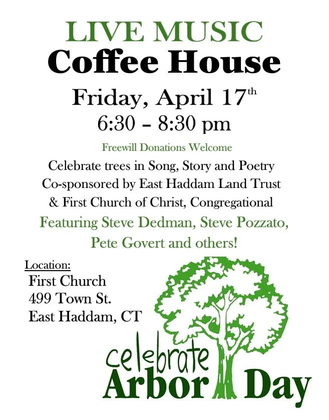 Think green and celebrate trees in song, story, and poetry at an Arbor Day coffee house at First Church of Christ Congregational, 499 Town Street, on Friday, April 17, from 6:30 to 8:30p.m., co-sponsored by First Church and the East Haddam Land Trust.